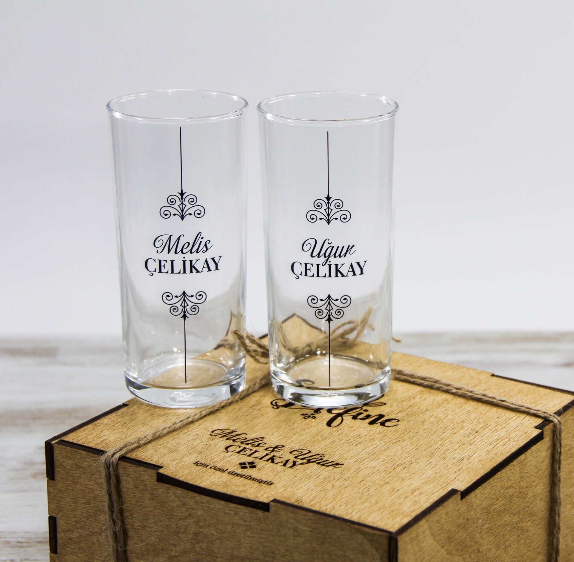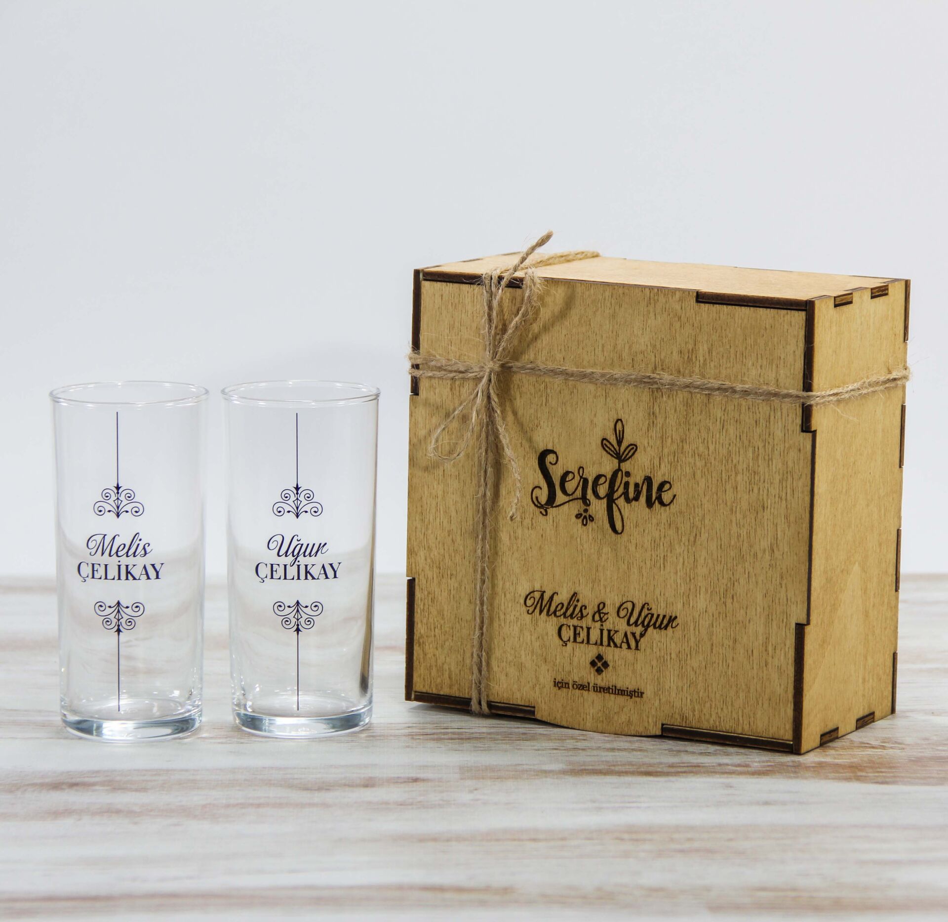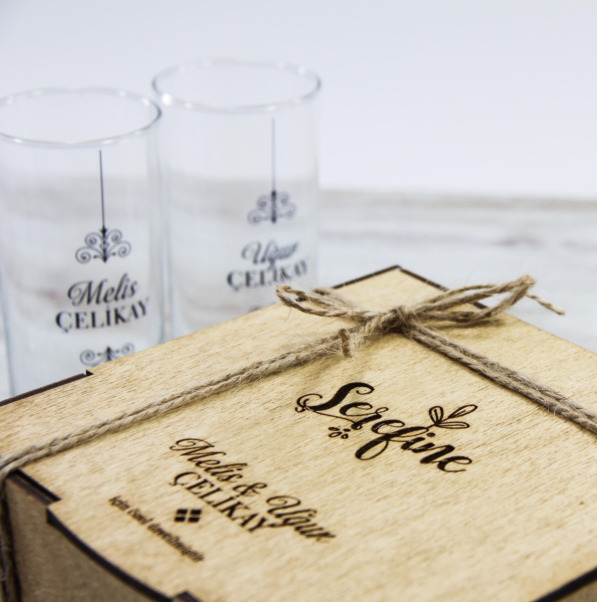 Sofraların vazgeçilmezi rakı keyfini özel kılmak isteyenler için tasarlandı: İki adet kişiye özel isim baskılı rakı bardağı, şık ve koruyucu detaylara sahip özel bölmeli ahşap kutu içerisinde sunuluyor.