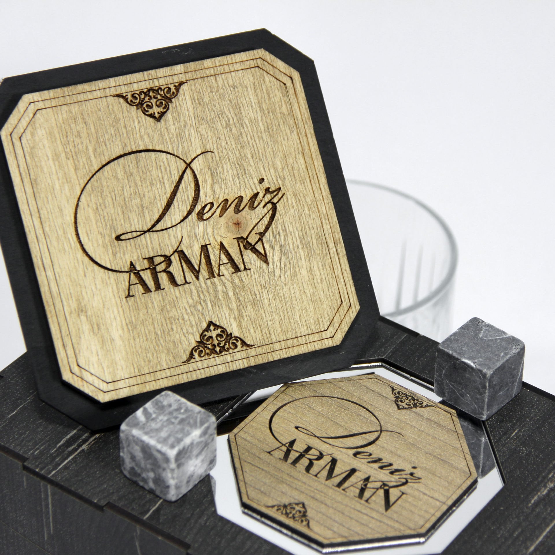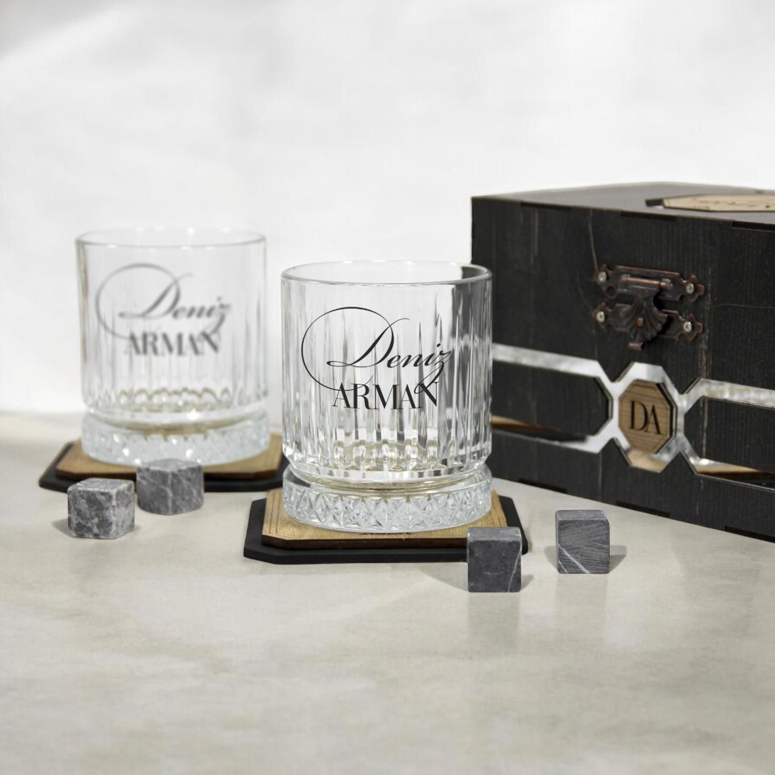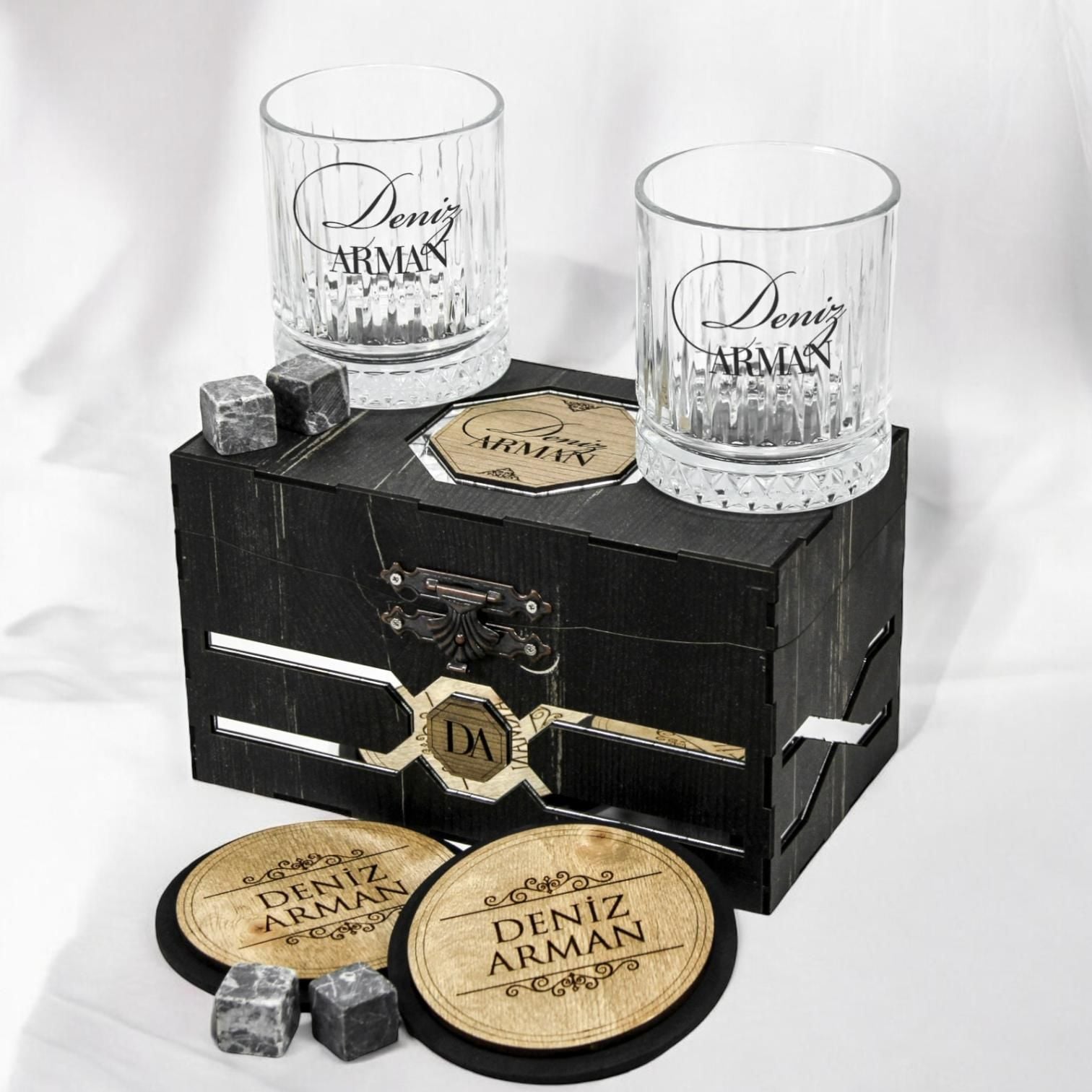 Ahşap kutu üzerine lazer işlemesiyle isim, tarih veya kısa mesajlar ekleyebilir; kadehlerin üzerine UV baskı ile silinmez baskılar yaptırabilirsin. Her parçanın dikkatle işlendiği bu ahşap kutulu viski seti, hediye sunumunda ayrıcalıklı bir deneyim sunar.