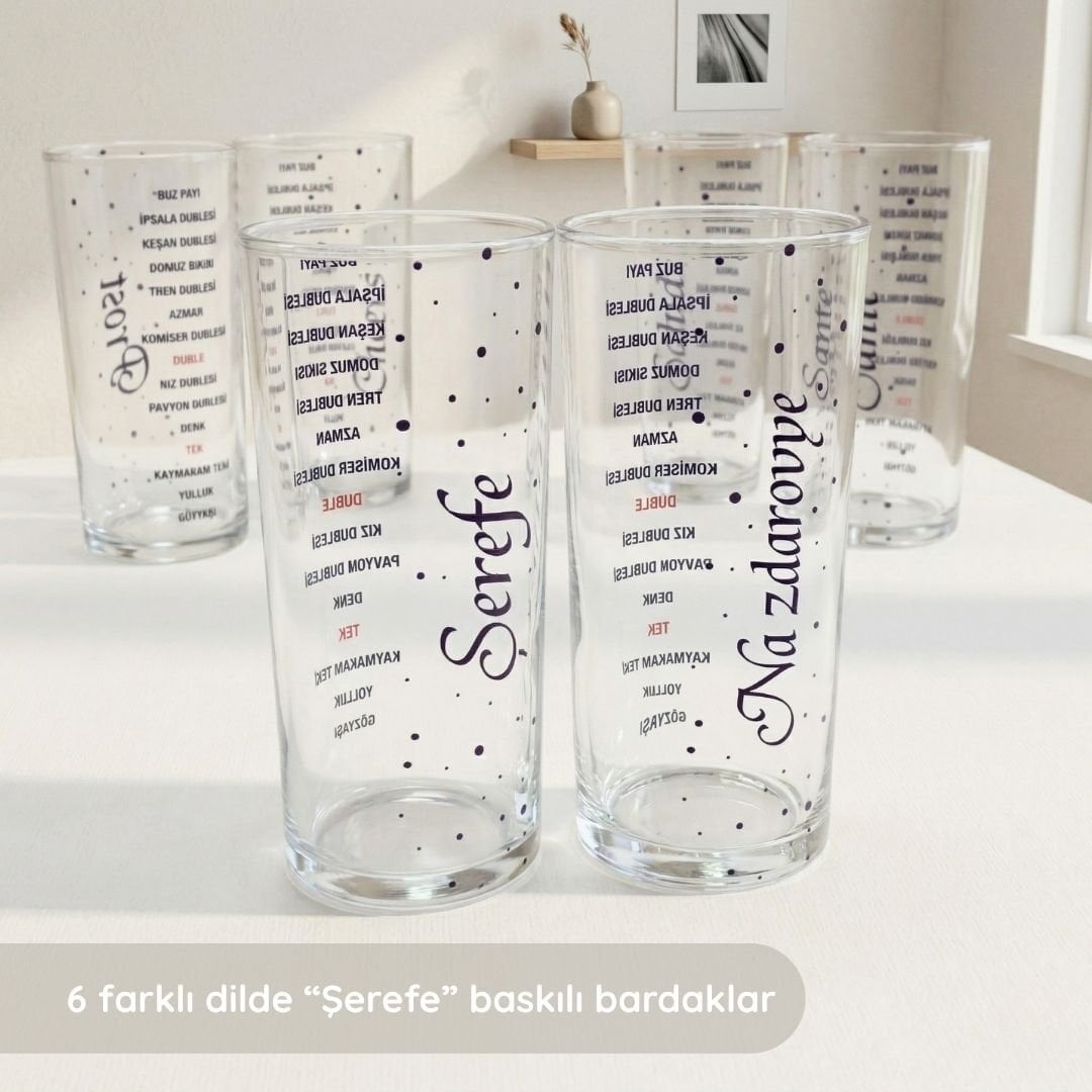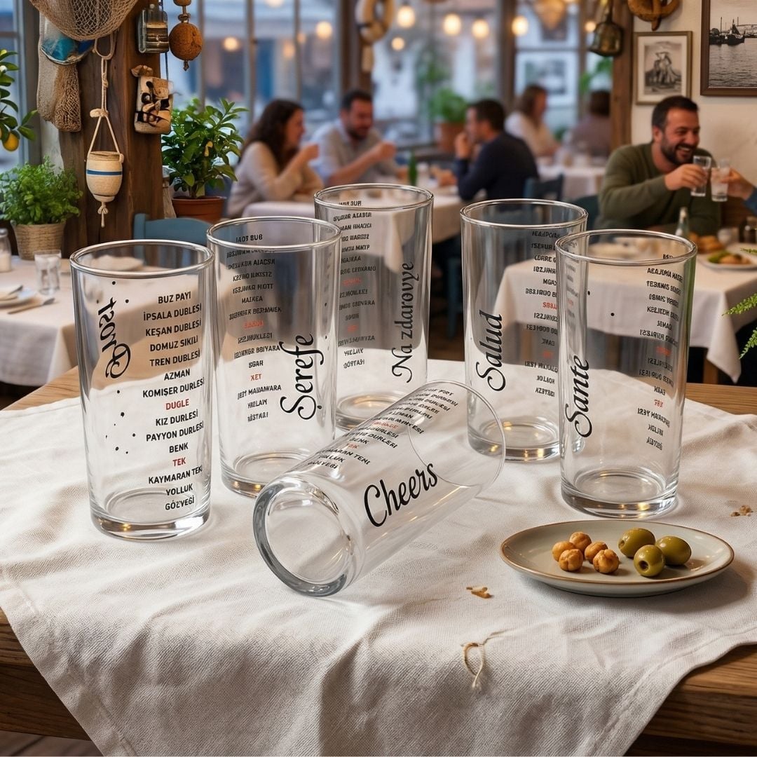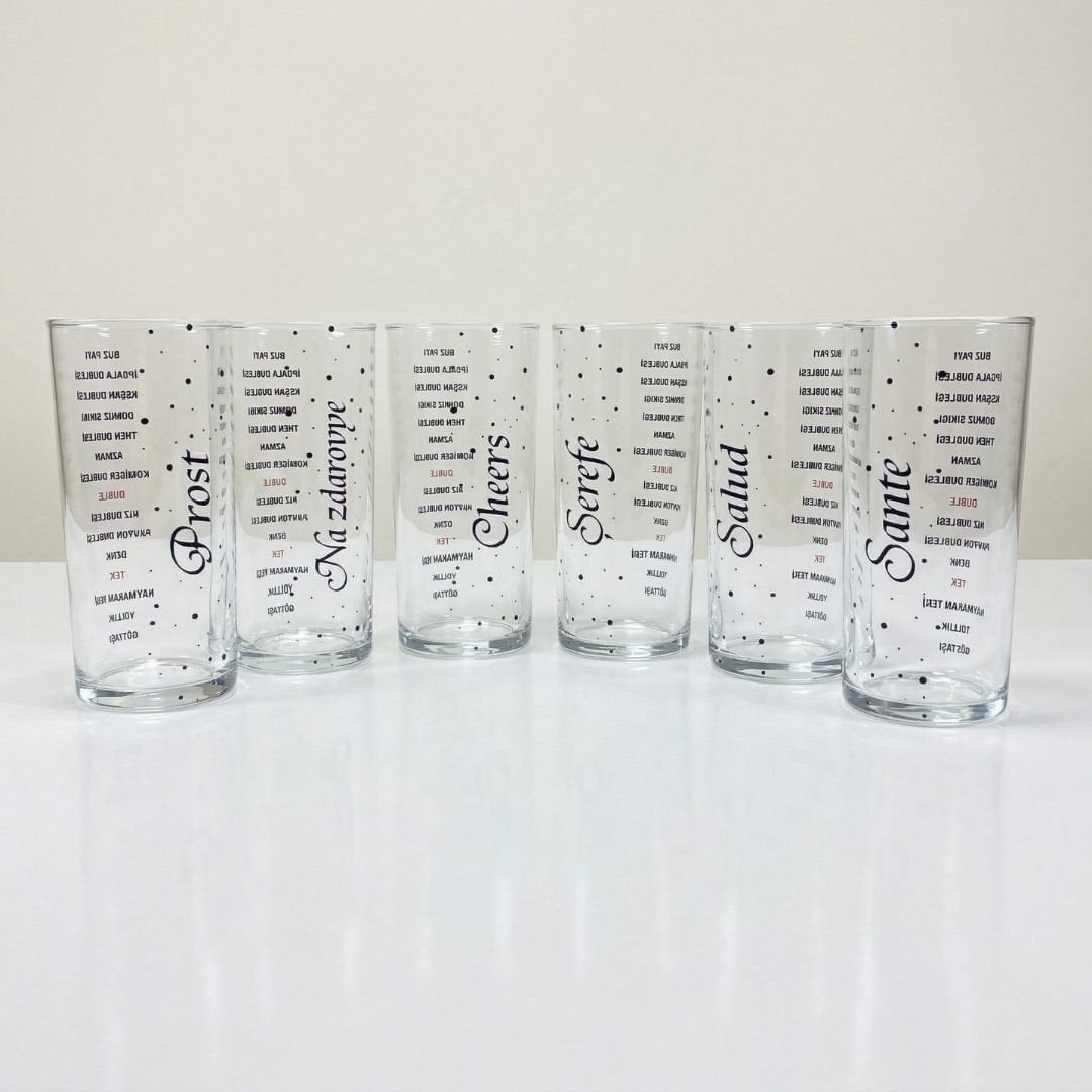 Muhabbetin sınır tanımayan haliyle tanışın! Dünya Dillerinde Şerefe Rakı Bardağı Seti, sofranıza evrensel bir neşe katmak için tasarlandı. Bu 6'lı setin her bir bardağında; Türkçe (Şerefe), İngilizce (Cheers), Fransızca (Sante), İspanyolca (Salud), Almanca (Prost) ve Rusça (Na Zdorovye) dillerinde en içten kadeh kaldırma sözleri yer alır.