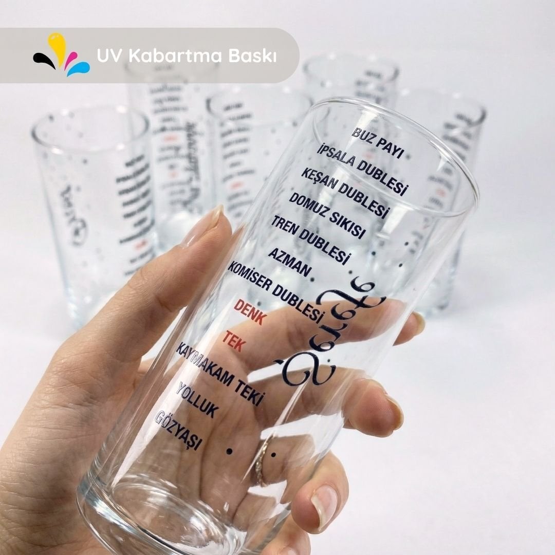 Bardakların ön yüzündeki bu şık ve kültürel tasarıma, arka yüzdeki esprili dublemetre baskısı eşlik eder. "İpsala Dublesi"ndnn "Kaymakam Teki"ne kadar uzanan ölçekli dublemetre tasarımı sayesinde sofradaki dozajınızı eğlenceli bir şekilde takip edebilirsiniz. UV baskı teknolojisi ile işlenen desenler uzun ömürlü, silinmez ve canlı bir görünüme sahiptir.