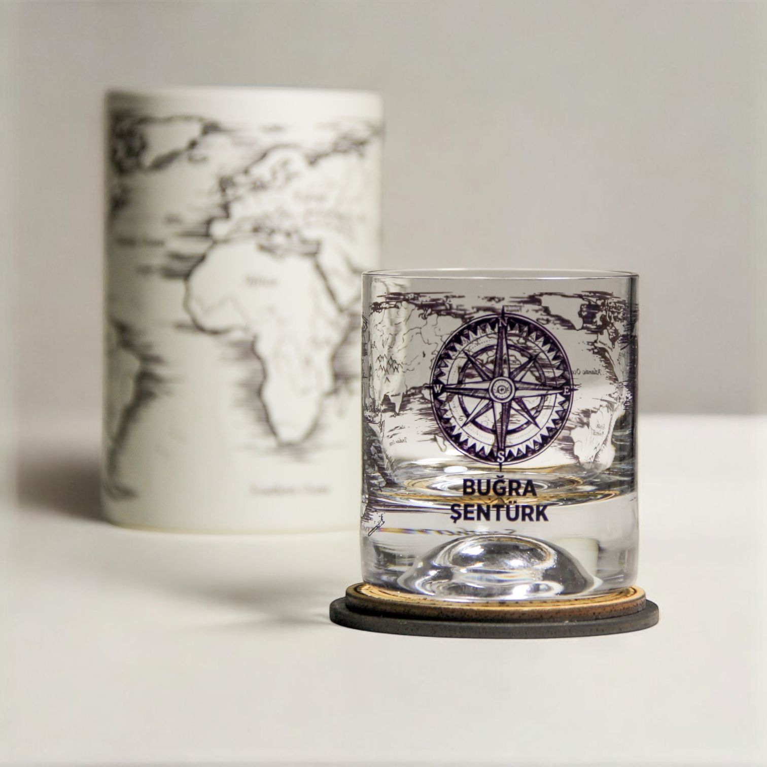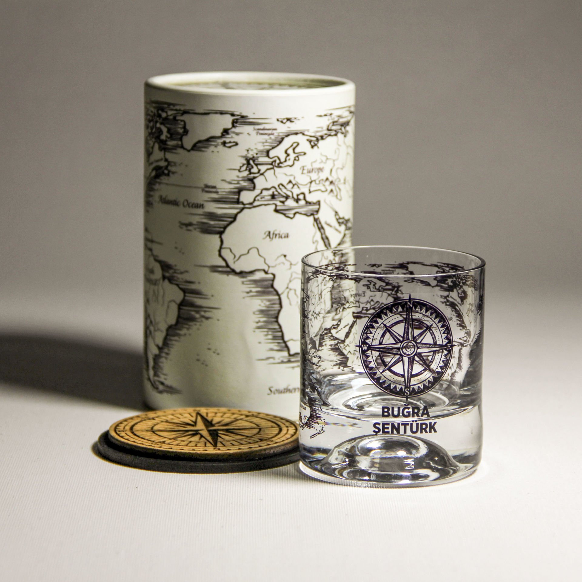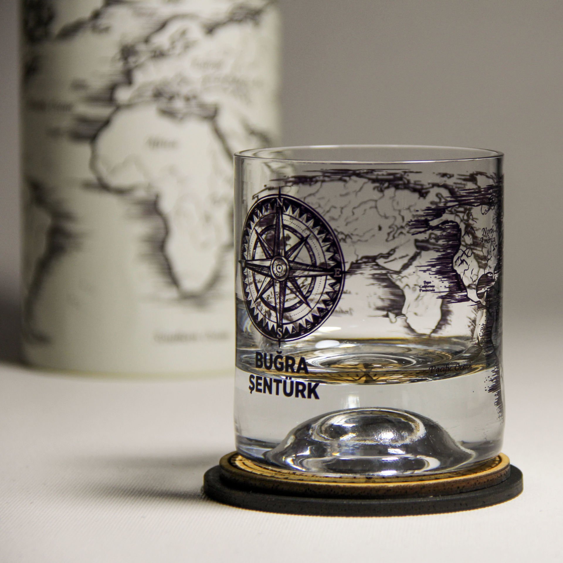 Dünya Haritası ve Pusula Kişiye Özel Paşabahçe Viski Bardağı