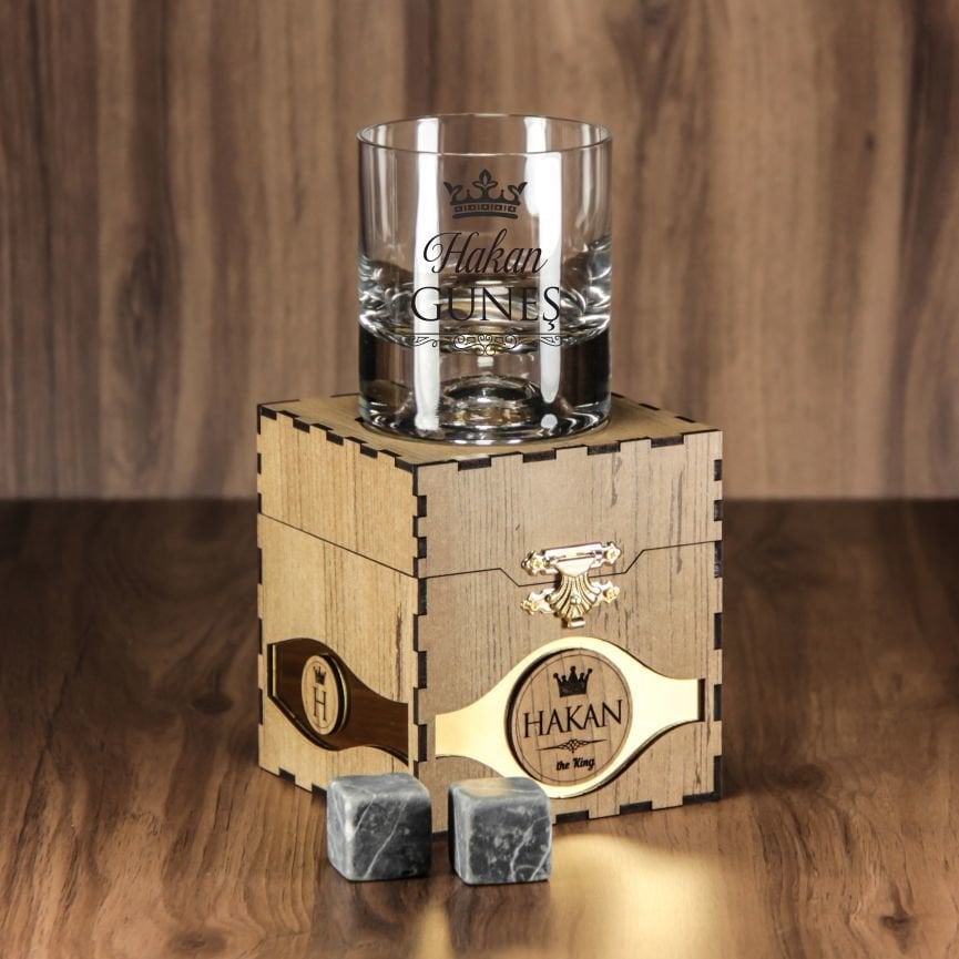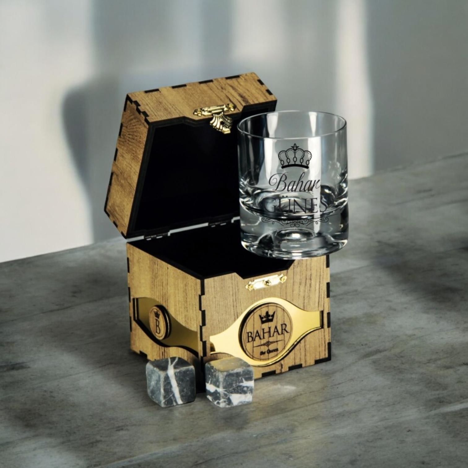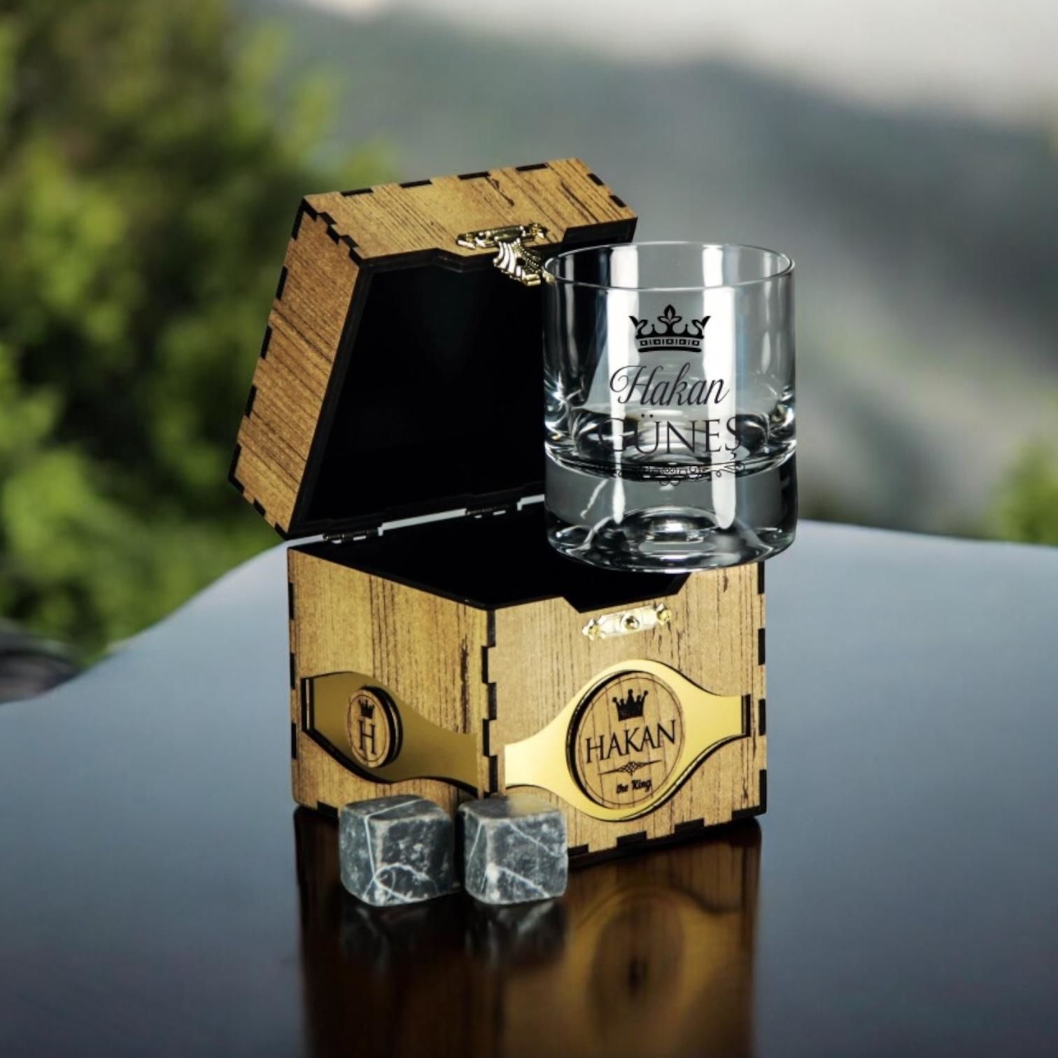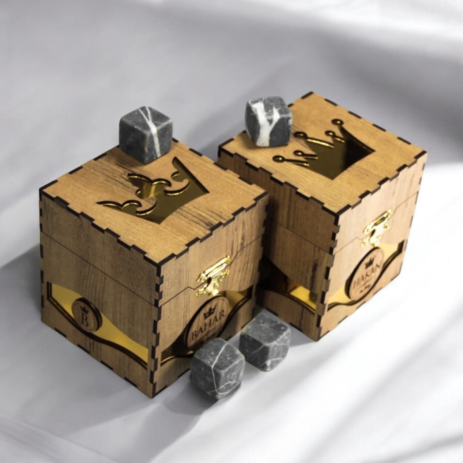 Bardaklar 205 ml hacme sahip, ağız çapı yaklaşık 7,5 cm ve yükseklik 8,5 cm’dir. Ahşap kutu ölçüleri 10×10×11 cm olup, gold ayna detaylar ve lazer yazı ile tamamlanmıştır. UV kabartma baskı yöntemiyle isim ya da mesajlar bardak üzerine kalıcı olarak işlenir. Bu ahşap kutulu viski seti, şıklığı yaşam alanınıza taşır.