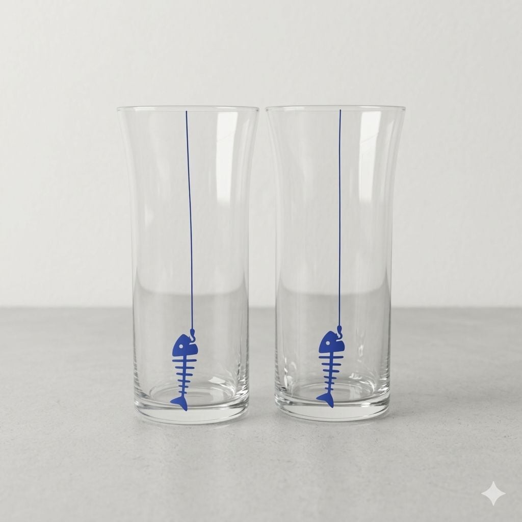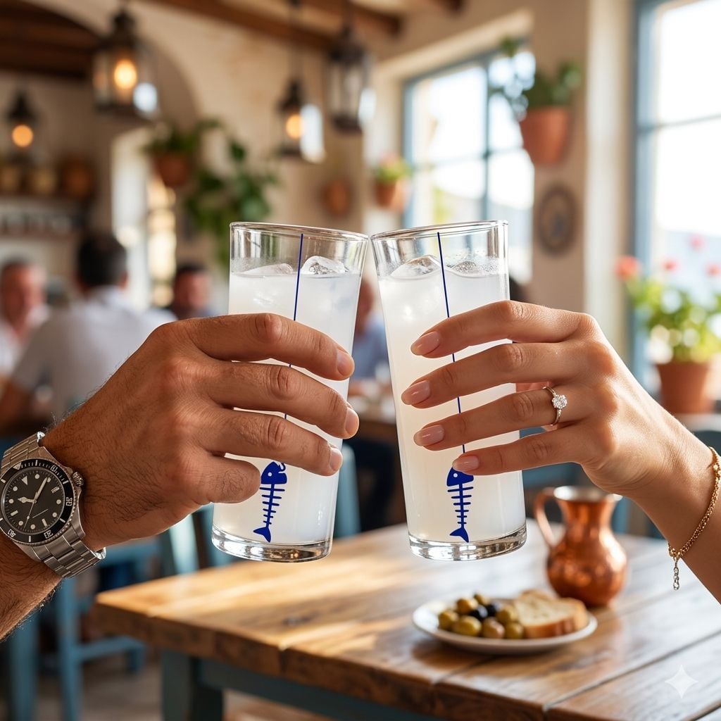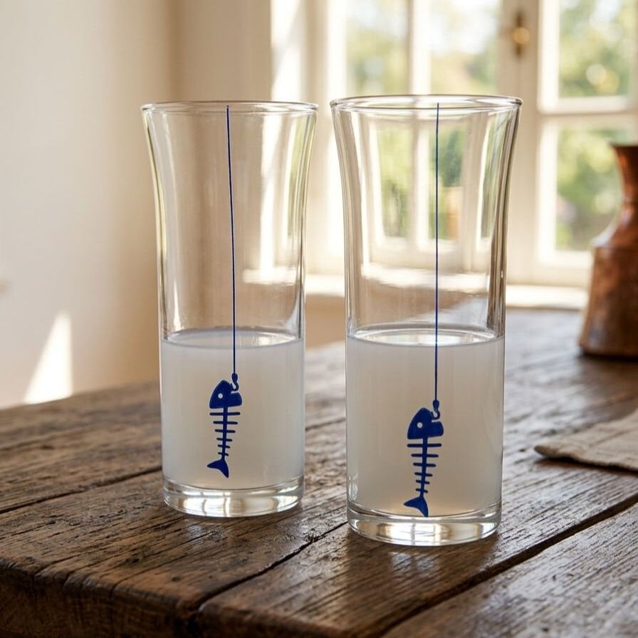 Geleneksel rakı sofralarına modern ve minimalist bir dokunuş: Öykü Serisi. İnce ve zarif formuyla öne çıkan bu kadehler, üzerindeki lacivert balık kılçığı ve olta figürüyle "denizden babam çıksa yerim" diyenlerin ve rakı-balık tutkunlarının vazgeçilmezi olacak.
